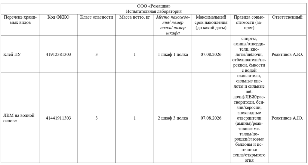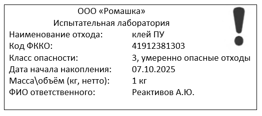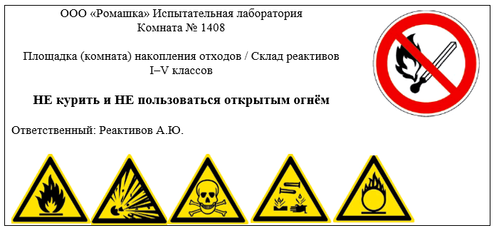 2. Прямого обязательного требования клеить ярлык на стеллаж/шкаф – нет. Место накопления должно быть специально выделено и соответствовать требованиям — его разумно обозначить табличкой, это хорошая практика и часто ожидаемо на проверках. В конце статьи Вы можете скачать редактируемую версию нижеприведенного примера: