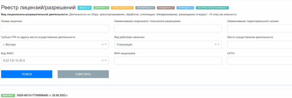 Отфильтруйте по региону, видам работ (например, «транспортирование», «обезвреживание») и так далее.