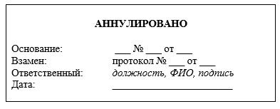 - Маркировку штампа об аннулировании, если применяете: где размещать, макет штампа, кто ставит, как хранить.
